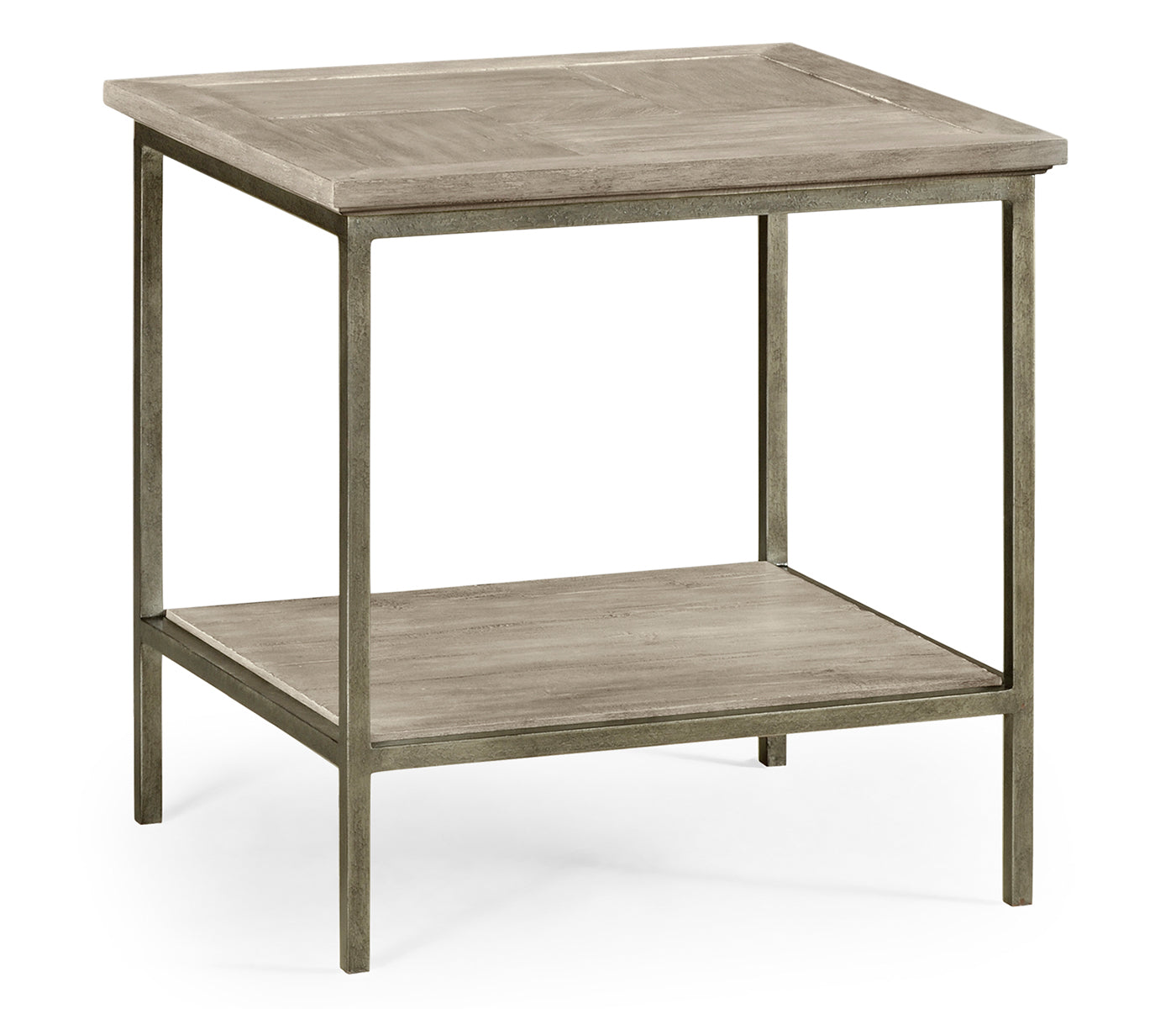 Bold parquetry end table combining a rustic grey finish with a contemporary grey silver iron base.
