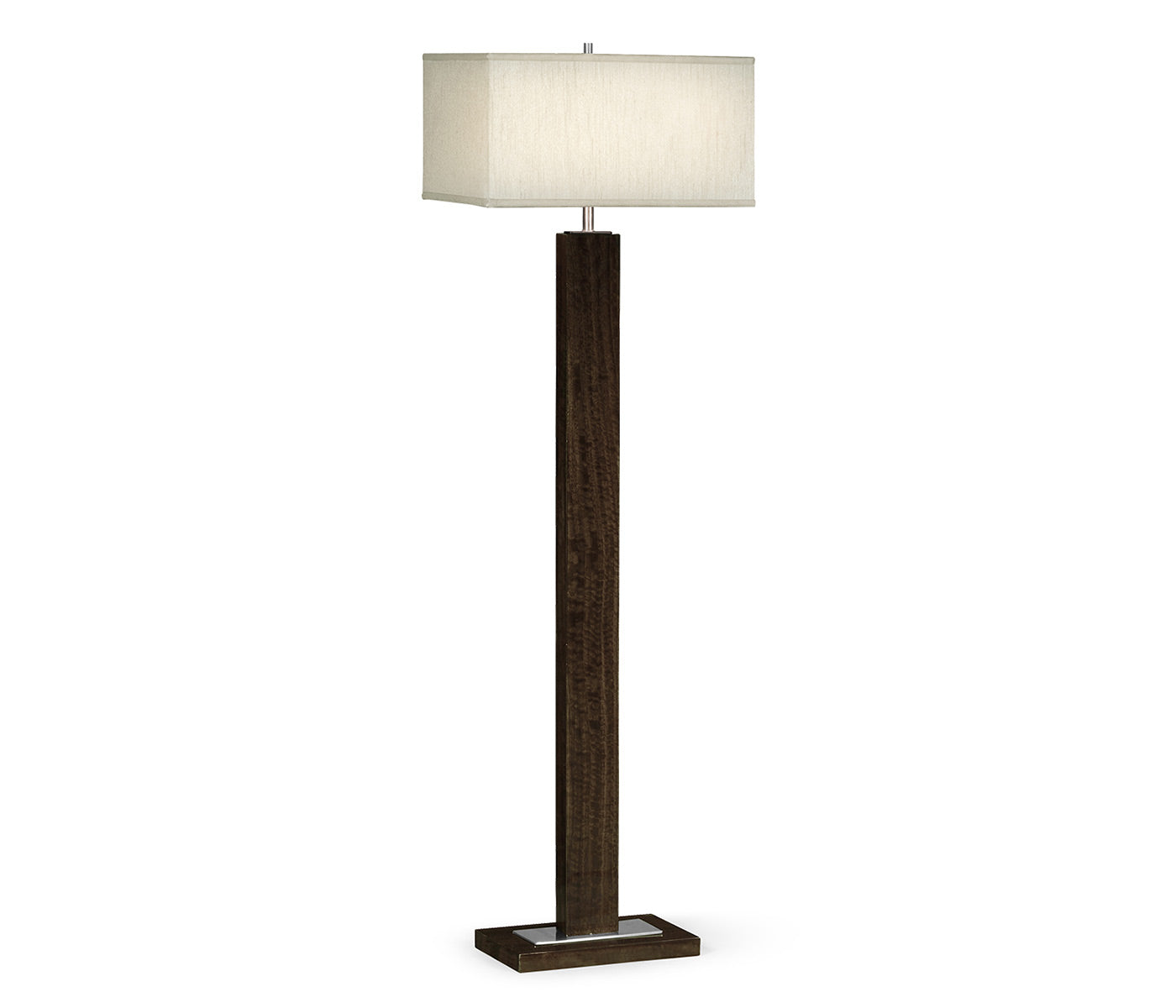 Rectangular floor lamp in high sheen black eucalyptus, with stainless steel detail base and a rectangular silk shade.