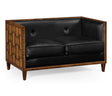 Transitional 2 seater sofa, fully upholstered, inspired by European mid-20th century design. The sides and back panels decorated with a woven parquetry inlay pattern in contrasting veneers. (Old salescode: 495295-BLL)