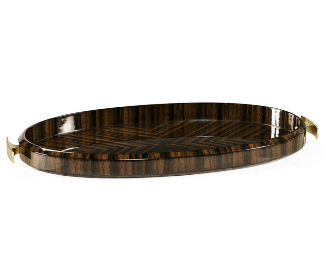 Art Deco style oval tray in a macassar ebony high lustre finish with geometric streamlined brass handles.