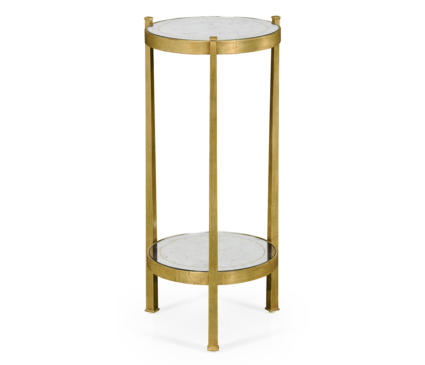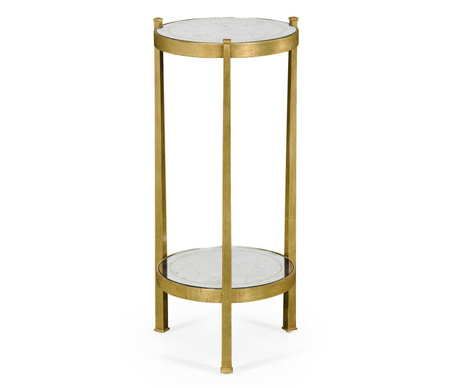 Contemporary wrought iron circular wine table in an antique gilded finish and handpainted Églomisé glass top and under-tier. The tapering legs rise above the height of the table top.
