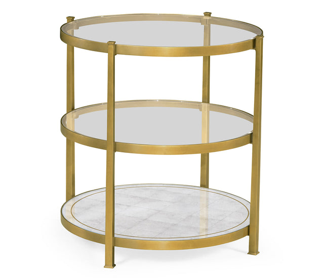 Wrought iron three tier round side table in an antique gilded finish, the upper shelves with inset glass panels, the undertier with églomisé glass.