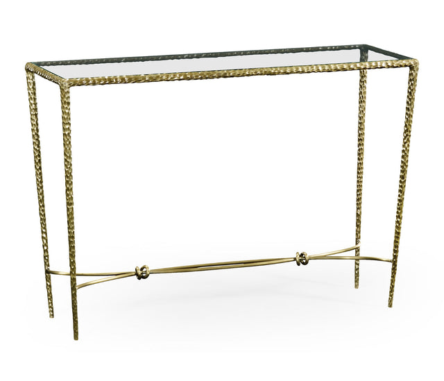 Stylish hammered and patinated light brown brass rectangular console table with inset glass top and ring detail. Inspired by Italian designs of the 1940's.