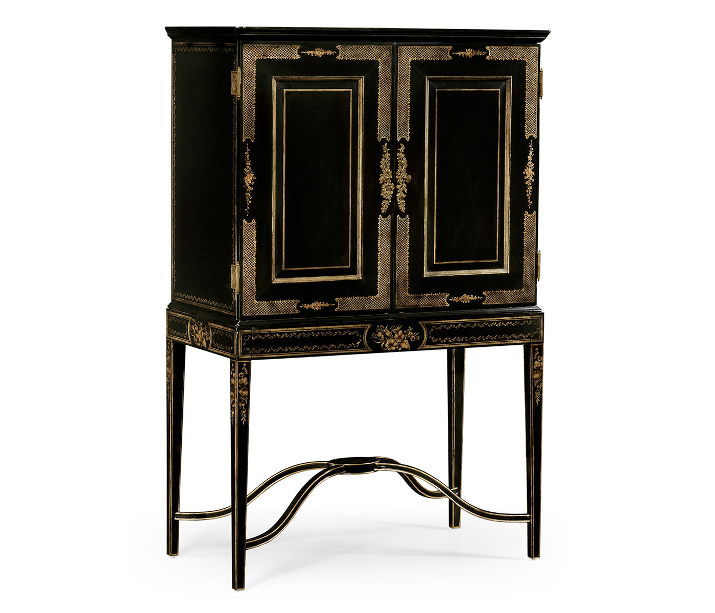 Black lacquered drinks cabinet on stand, lined with silver leaf églomisé glass and a single drink mixing shelf as well as glass storage, the doors with fine hand painted gilt floral details, and with further gilt painted details throughout. Finely cast floral brass door escutcheons. (Old salescode: 492356)