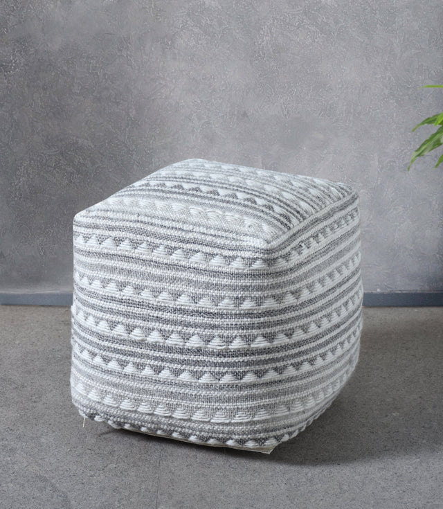 Introducing the Kruzan Pouf, a harmonious blend of ivory and grey hues, hand-woven with luxurious wool. Its intricate design and contrasting colors create a striking statement piece that effortlessly complements any interior. Experience its plush comfort and elevate your space with the distinctive charm of the Kruzan Pouf.