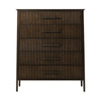 The Lido Chest, crafted from Prima Vera in our Bistre finish, features a sophisticated tapered silhouette with 5 reeded drawer fronts. The custom forged hardware, finished in a dark rubbed bronze, echoes the reeded details throughout.