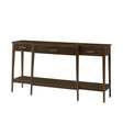 The Lido Console II, crafted from Prima Vera in our Bistre finish, features an elegantly tapered silhouette, reeded detailing, three drawers and a shelf. The custom forged hardware, finished in a dark rubbed bronze, echoes the reeded details throughout.