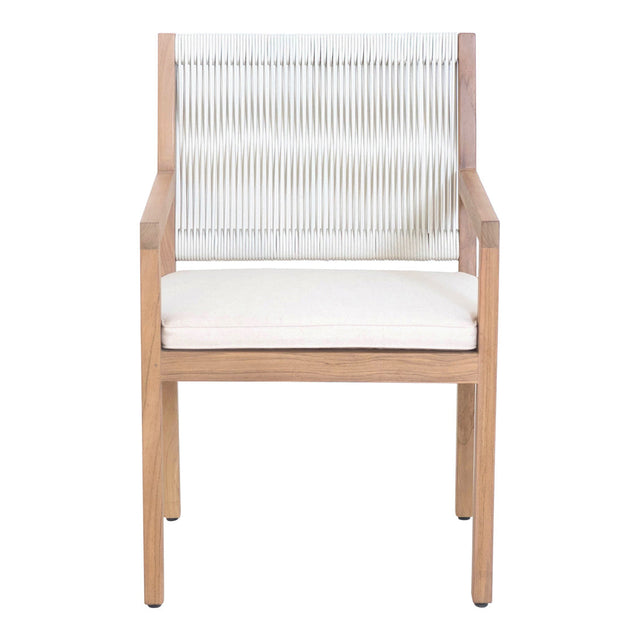 Let the sunlight shine bright on the beautiful white synthetic wicker weave of the Luce outdoor dining chair. Its warm teak frame turns into a darker patina over time, while a removable, easy-to-clean ivory white cushion captures the light and dark contrast of this gorgeous piece. Dining al fresco never looked so good.