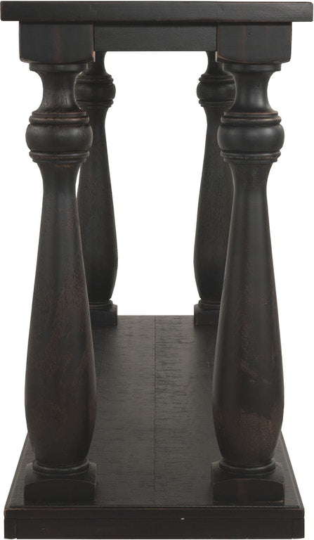 The Mallacar black sofa table has a dramatic presence—exactly what an eclectically styled room needs. Solid wood planks and thick veneer merge seamlessly together for a hearty helping of style. Handsomely turned legs connect to a lower shelf flush with the floor. A rustic wirebrush technique gives this stunning sofa end table in black with show-through contrasting just enough of a weathered sensibility.