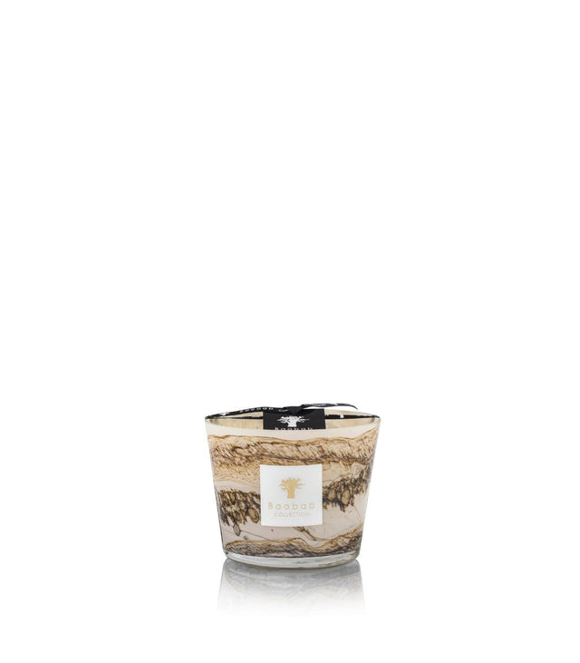 The hand-blown glasses of the Siloli candle showcase shades of beige and brown on which horizontal lines are formed with small organic and random specks.