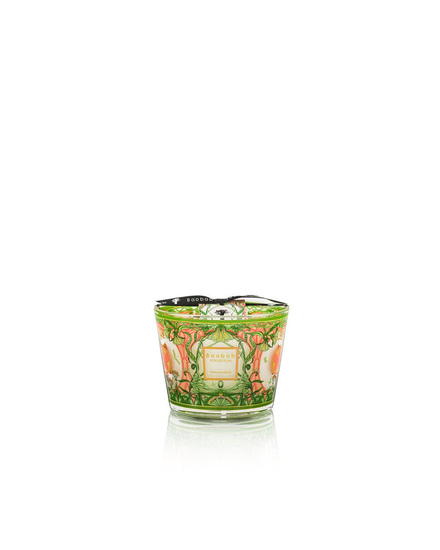 The Tomorrowland scented candle is silk-screened in a powder pink and green design featuring the logo of the famous Belgian music festival.