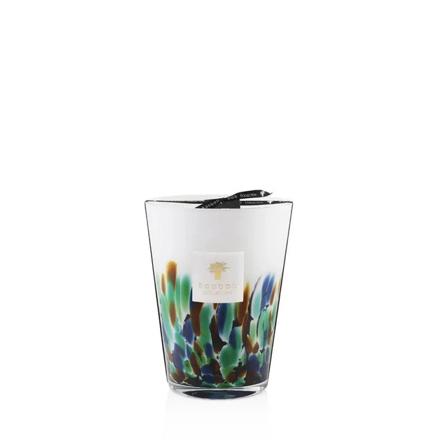 The Amazonia scented candle is a hand-blown opaline glass in which turquoise, blue and brown glass confetti is inserted.