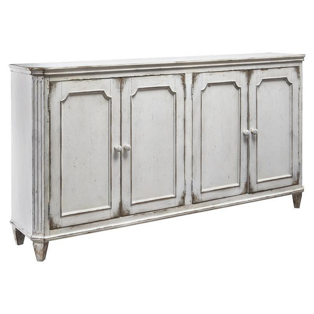 With its distressed vintage paint finish, fluted details and French provincial mouldings, the exquisite Mirimyn cabinet is sure to grace your space in such a très chic way. Adjustable shelved storage is abundantly practical, be it in a dining room, living room or entryway.