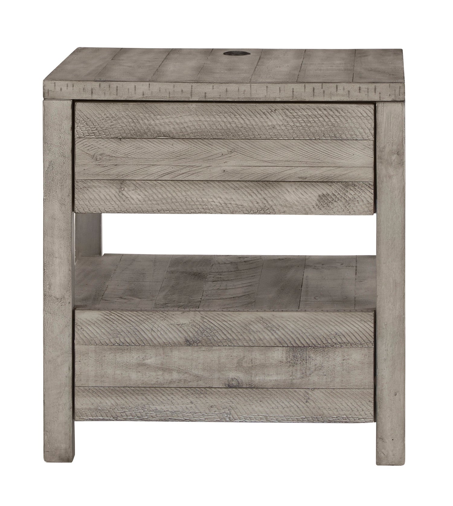 Balancing chic flair with a relaxed sensibility, the Naydell end table strikes just the right tone for rustic sophistication. Beautifully clean lines are subtly enhanced with relaxed distressing and saw marks for authentic barn wood character. Featuring two drawers and a dual USB port to keep your devices conveniently charged, this end table has just enough flair and functionality.