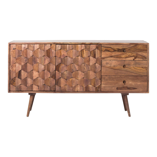 Crafted from solid sheesham wood, the O2 Sideboard has loads of storage in a compact size. The contoured doors add texture and dimension to your room. Set on thin pencil-styled legs, to add an elegant touch.
