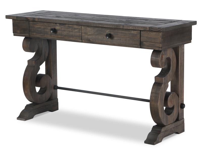 The Bellamy Sofa Table by Magnussen is designed with 2 drawers and a metal stretcher. The Bellamy occasional collection has an 'old world charm' with gracious s-curved carved bases, overlaid solid pine tops and a vintage inspired deep weathered pine finish. The matte black Peppercorn finish is beautifully accented by pewter hardware and metal stretchers. Bellamy creates the perfect accent to set the mood for stunning European influenced elegance.