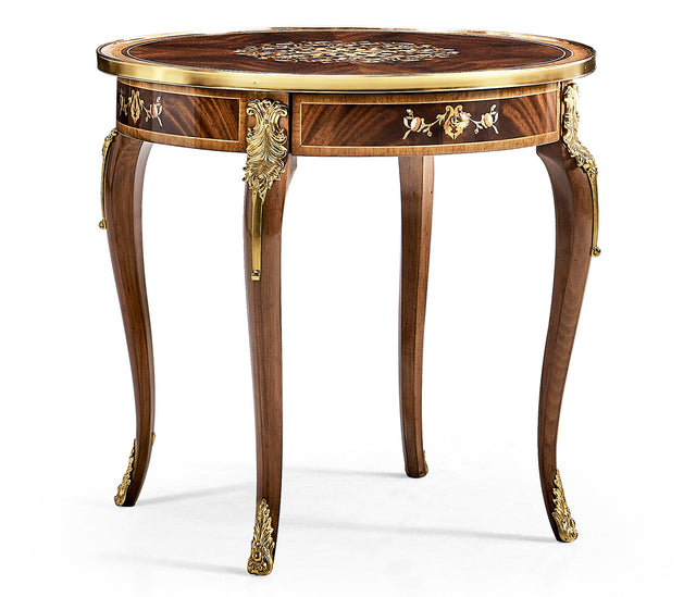 This lamp table features mother of pearl and marquetry inlays. Finished in medium antique mahogany, the level of detail in this piece adds a regal element to any space.