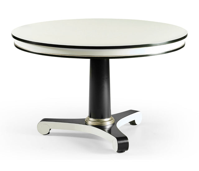 Inspired by the Biedermeier era, Dipole’s clean lines, classic vibes and versatility make it suitable for a variety of settings - dining, foyer, office or living. Bold black and white lines are accented with silverleaf collars for the perfect amount of understated drama that compliments an array of styles.