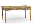 Elegantly styled narrow desk or side table with golden amber burr veneer and three drawers with subtle stringing inlay. Raised on four tapering sabre legs.