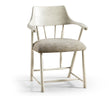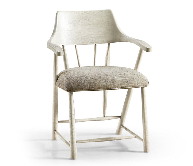 The transient captains chair from Jonathan Charles' Reimagined portfolio references modern stylings and Scandanavian sentiments. The solid hardwood frame is finished in zinc white with interlocking supports for a clean and minimal aesthetic. An upholstered seat covered in Kravet fabric provides just the right amount of cushion while transients shapely wooden arms curve up to meet the swell of a mid-level back rest that delivers a posh and comfortable seating experience.