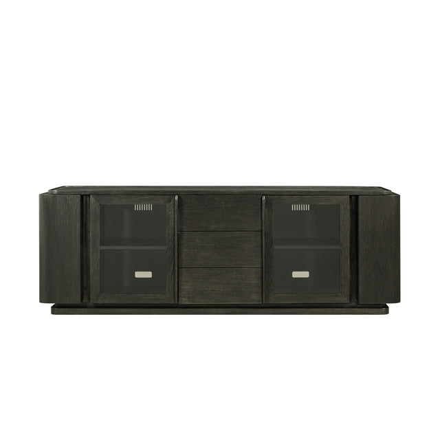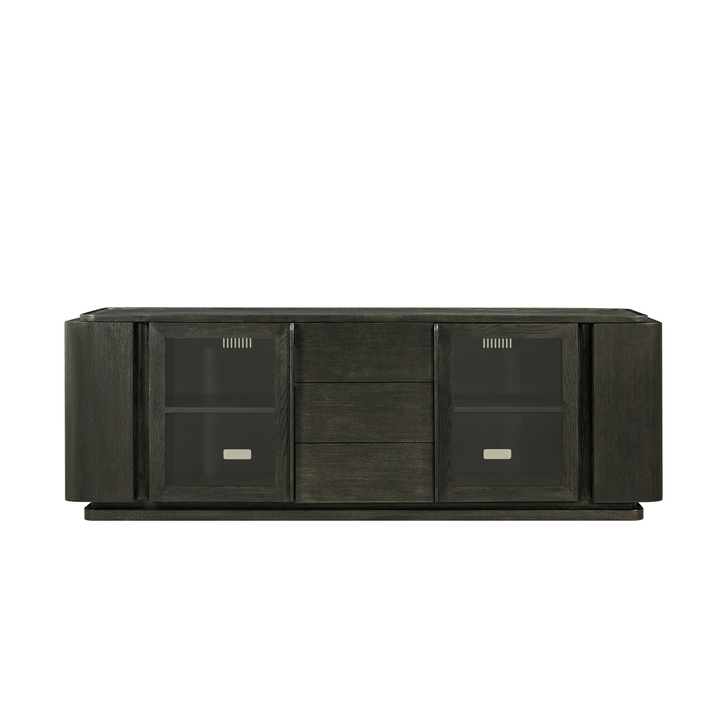 The Repose 80 Glass Door Media Console has an amazing amount of storage for all your media. 2 glass front cabinets with adjustable shelving, cord cutouts and vents at the back. Hidden on the ends are curved doors that conceal 2 small shelves to store away small items, and three, smooth faced, soft close drawers at the front finish the look of this highly functional cabinet which is offered in 2 wood veneer finishes;Grey Oak and Charcoal Oak.
