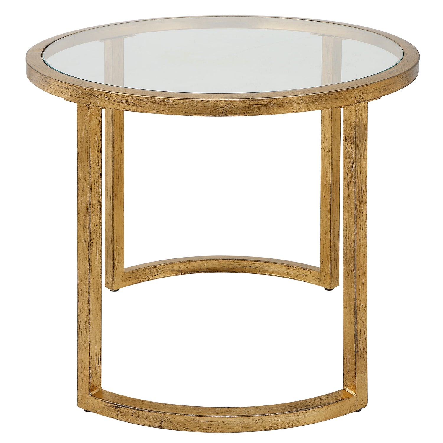 Designed to be a end table. Crafted from hand forged iron and finished in a heavily antiqued gold leaf.
