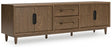 Introducing the Roanhowe TV stand, inspired by the architectural language of mid-century expression. Its spacious cabinets and drawers provide ample storage, while a sleek design allows the natural beauty of the wood to shine through. Ready for a cinematic experience? This entertainment center is perfect for movie nights and relaxation.
