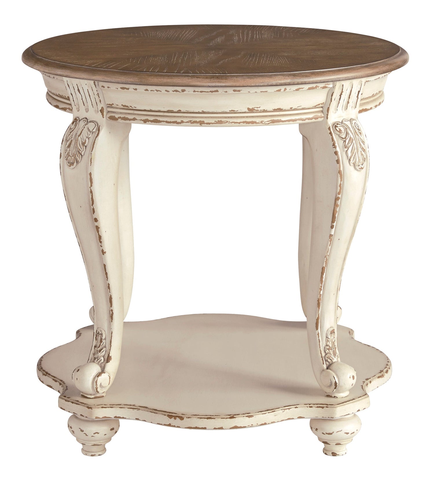 Elevating the art of traditional cottage styling, the Realyn round end table is sure to serve you beautifully for years to come. Antiqued two-tone aesthetic blends a chipped white with a distressed wood finished top for added charm. Classic cabriole legs and shapely lower shelf are a lovely twist. Decorative corbels add refinement.