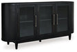 Dining Room Server,Dark,Made with hardwood solids and oak veneer;Black finish on textured wood grain surface;3 glass cabinet doors;Interior shelving;Burnished nickel-tone pulls;Tapered legs;Assembly required