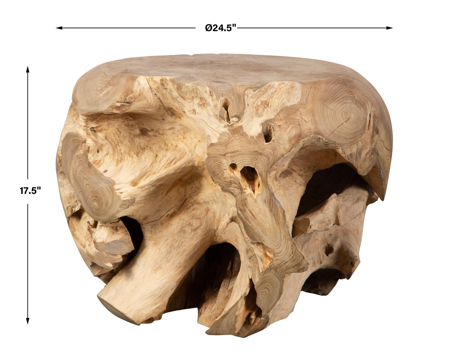 Formed by nature the Sola side table provides organic beauty and function in a natural bleached teak, serving as a decorative art piece while smoothed on top for functionality. Each will vary in size due to being uniquely handcrafted. Cracks and variation in grain are normal.