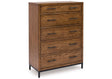 Five Drawer Chest,,Made with rubberwood solids, mango wood veneer, MDF substrate and metal;Natural look wood finish;Black metal legs; tapered black metal bar pulls;5 drawers with fully finished interior, dovetail construction and heavy-duty ball bearing side glides (top drawer felt lined)