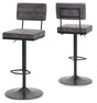 Tall Swivel Barstool (2/CN),,Metal frame;Durable matte black powder coated finish;Foam cushioned seat and back with gray faux leather upholstery;Tightly-tailored channel stitching;360-degree swivel seat;Adjustable-height pedestal;Footrest for added support;Assembly required
