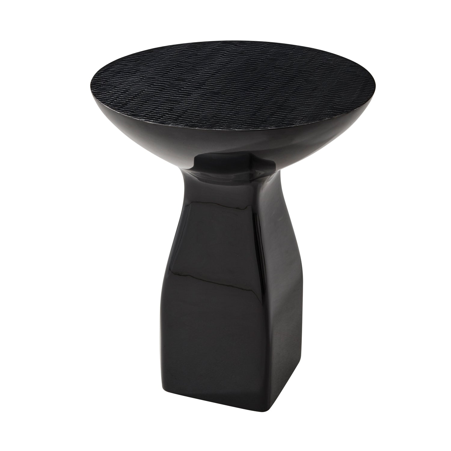 A lacquer pedestal accent table, the silvered patterned and flared circular top above a shaped square pedestal base.