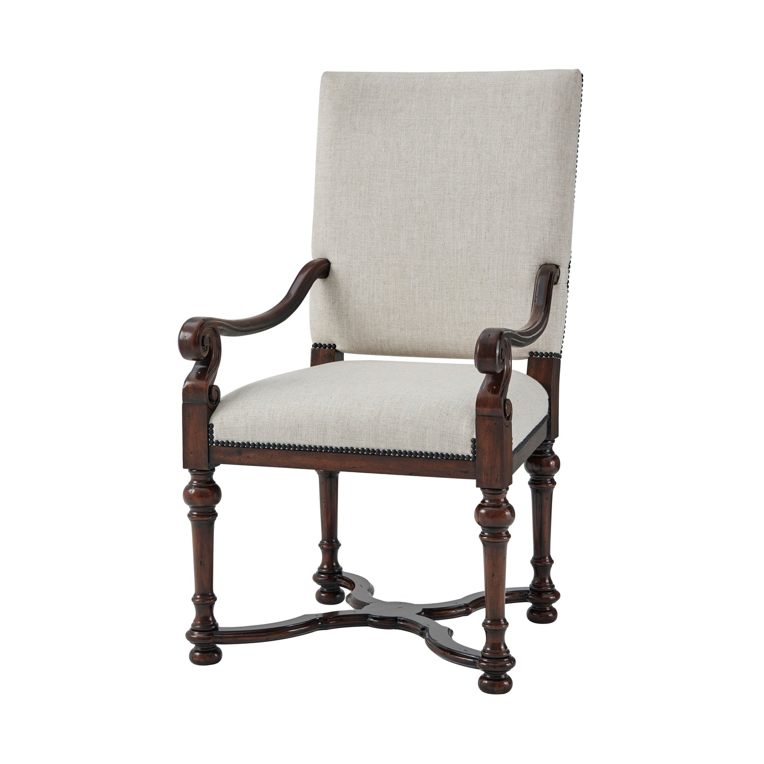 A hand carved armchair, the rectangular padded back and upholstered seat on turned tapering legs joined by a wavy ‘X’ stretcher. The original William and Mary.