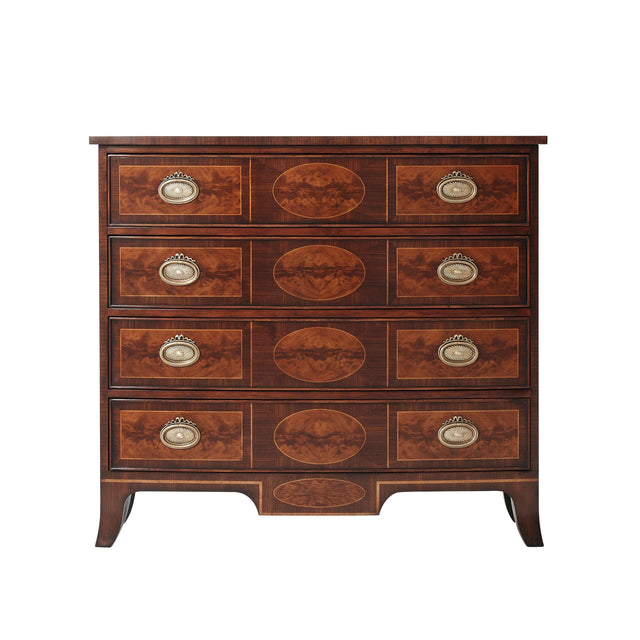 A mahogany, flame veneered and walnut banded chest of drawers, the bowfront top above four oval panel inlaid drawers on splay feet.