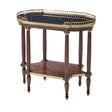 A marble top mahogany lamp table, the white veined black marble D end top with a three quarter brass gallery on fluted supports joined by a concave sided undertier.
