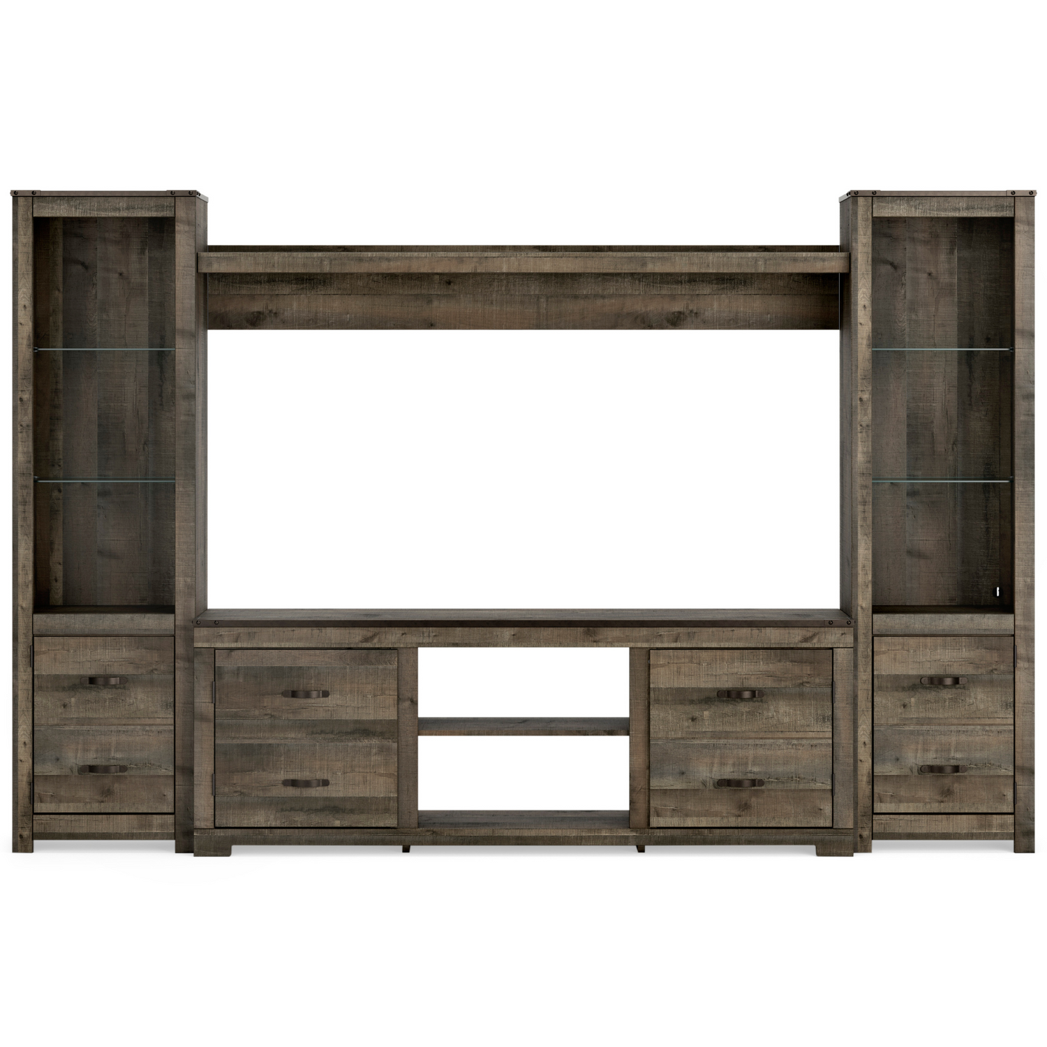 The Trinell large TV stand with fireplace option makes your home on the range look so alluring. The aesthetic is earthy yet clean and sophisticated, with a rustic finish, plank-style details and nailhead trim that pay homage to reclaimed barn wood. Removing the shelf allows room for the optional electric fireplace for instant warmth and romance.