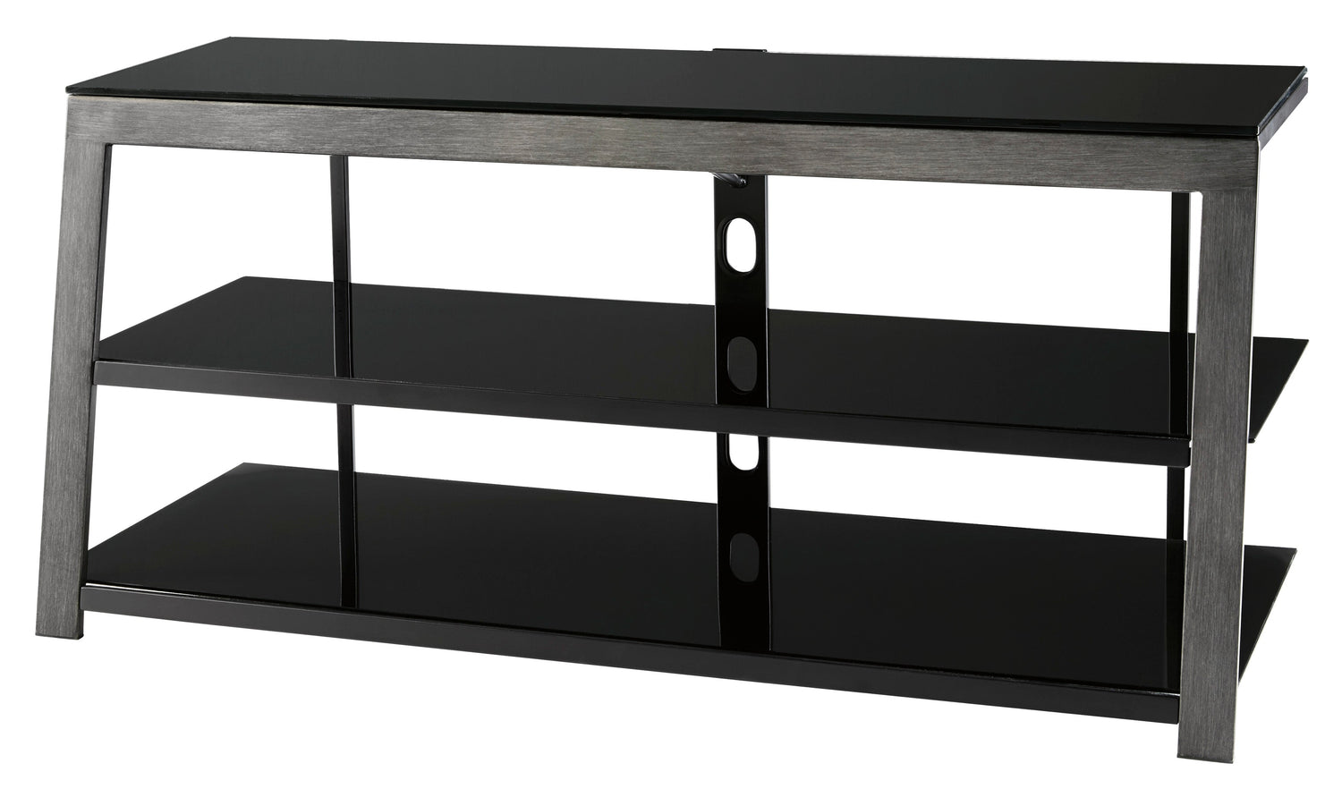 For those who appreciate open-concept design, the Rollynx TV stand is beautifully in tune. Cool and contemporary, this TV stand really steps it up with cantilever styling and a two-tone finish that blends an aged silvertone metal frame with sleek black glass shelves. A wire management support bar helps maximize the minimalism.