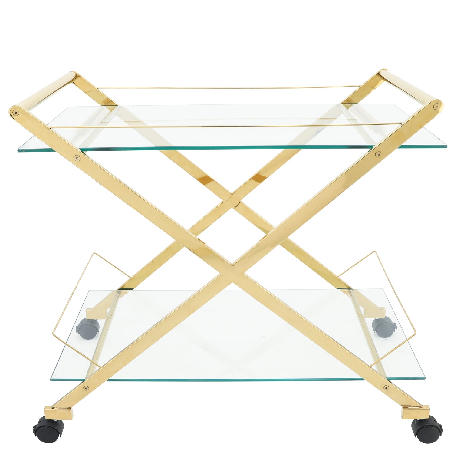 A must-have for upscale dinner parties or just making your decor more distinctive, this chic bar cart arrives brimming with feminine charm. Each of its 2 shelves offers up a mirrored glass design for a look that spells out classic glamour. Its X-frame base will add a unique style, while also creating eye-catching appeal in your space. Plus, handles on either side offer easy movement.