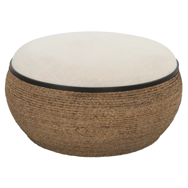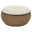 A Unique Blend Of Casual And Coastal Styles, This Ottoman Is A Versatile Storage Piece With A Removable Lid. Can Be Used As Seating, A Footrest, Or Cocktail Table. The Round Base Is Wrapped In Natural Braided Straw With Matte Black Iron Details And A Plush Upholstered Seat In Light Beige Performance Fabric.