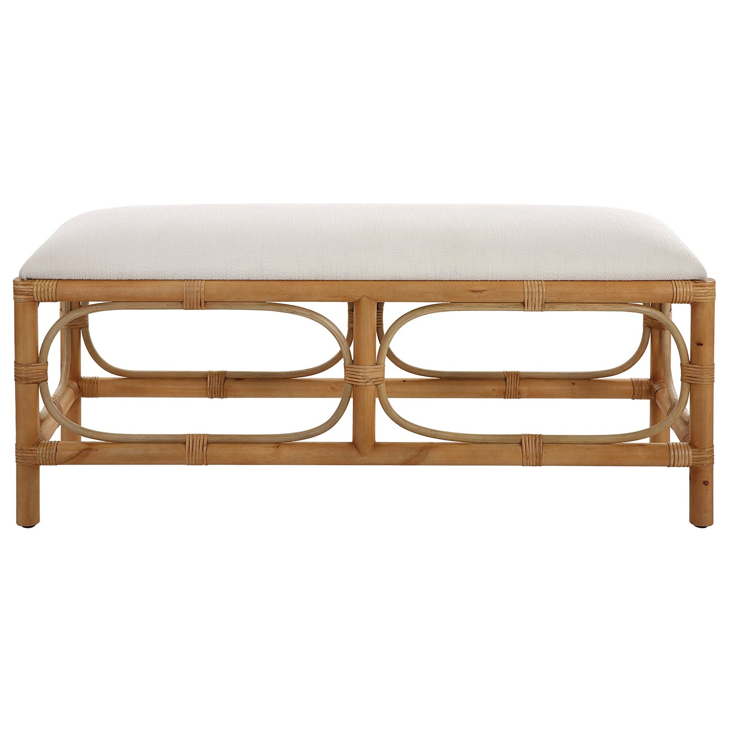 A Refreshing Coastal Accent Featuring A Crisp White Textured Fabric, Over A Naturally Finished Solid Wood Base With Rattan Wrapped Accents. Perfect At The Foot Of A Bed Or As Additional Family Room Seating.