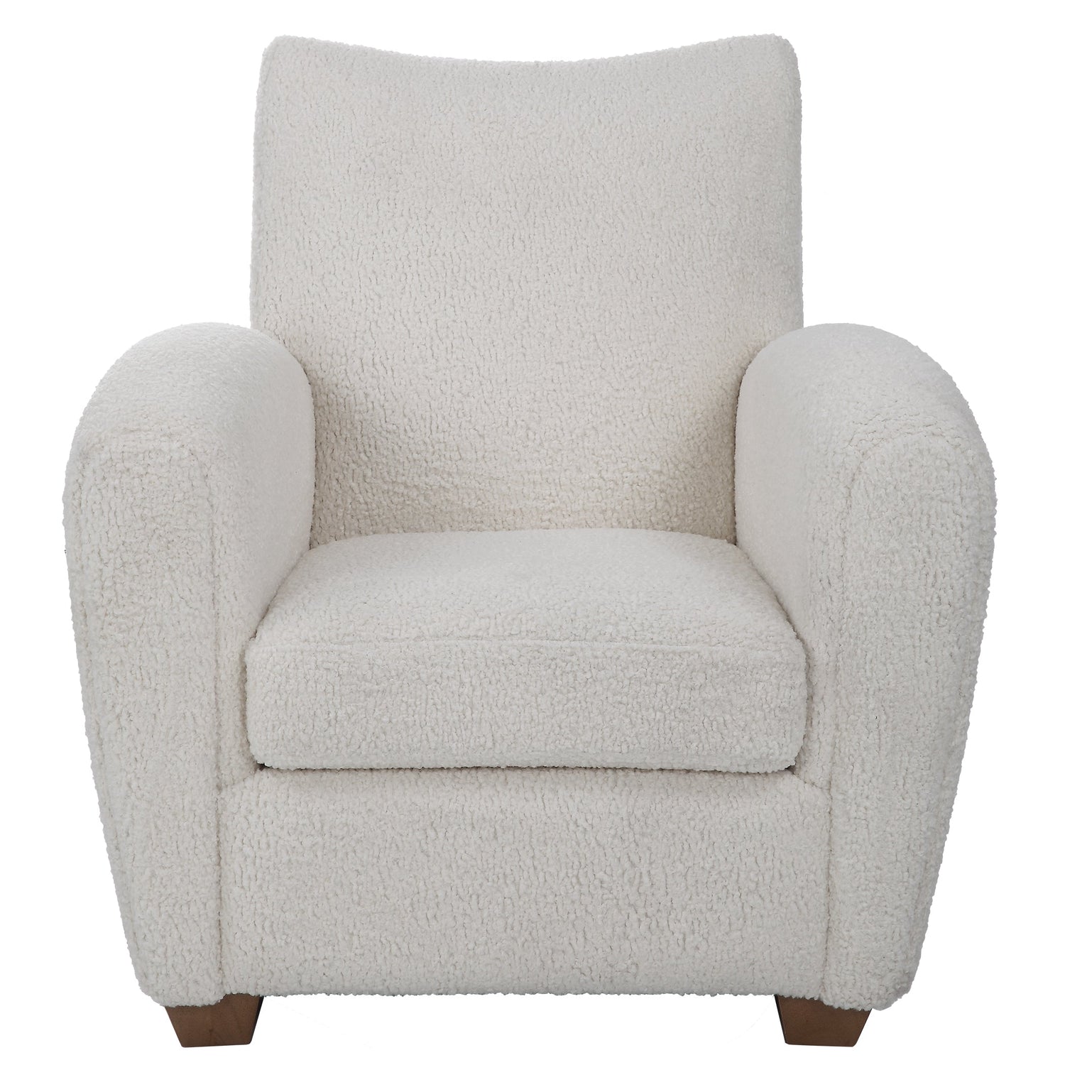 With Its Curved Track Arms And Supportive Back, This Cozy Accent Chair Is The Perfect Balance Of Comfort And Style. Fully Upholstered In A Soft Off White Faux Shearling And Accented By Walnut Stained Wooden Feet. Seat Height Is 18".